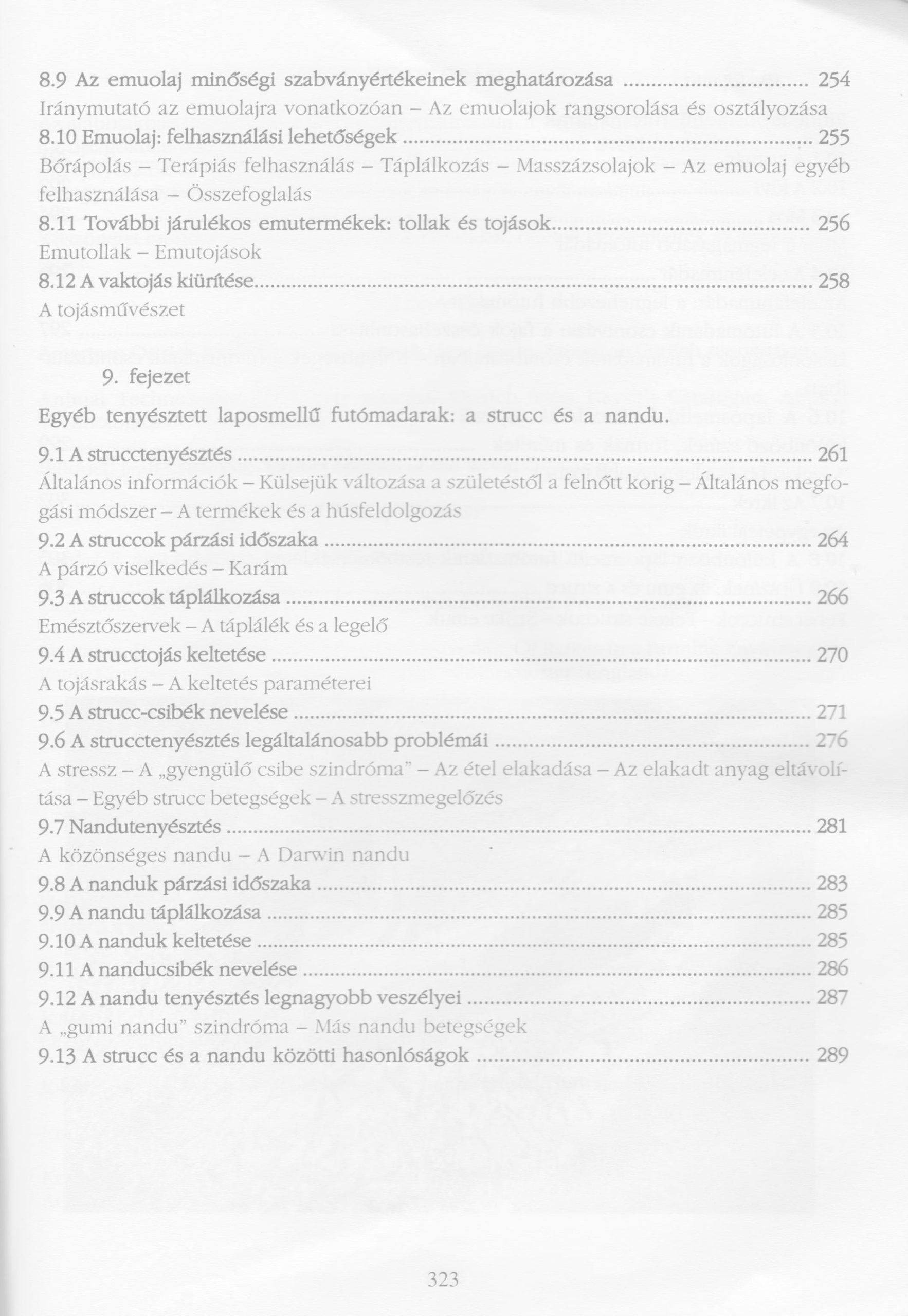 A könyv - minden esetben a felhasznált irodalom jegyzékével záródó - fejezetei a legalapvetőbb anatómiai, élettani, genetikai és etológiai tudnivalók mellett még a strucc szociális és szexuális viselkedésére is kitér, valamint precíz részletességgel taglalja a csibék gondozásával, a takarmányozással, a keltetés technológiájával és folyamatával, illetve az állatok egészségvédelmével kapcsolatos információkat.